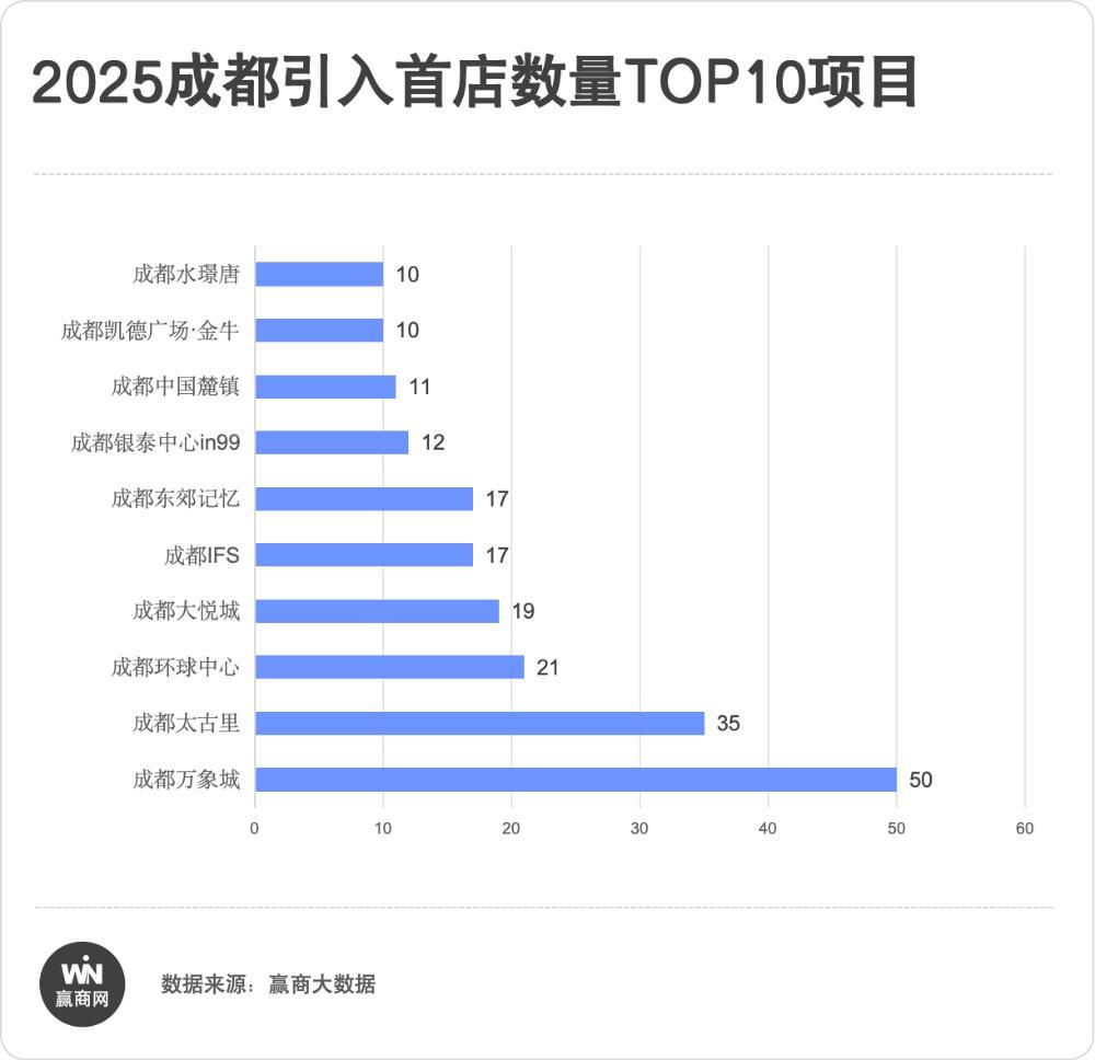 2025年,成都引进品质首店数量前十的商业项目共引进首店202家,占全年总首店数的50.9%,头部集聚效应显著,超半数首店集中于这十大商业载体: