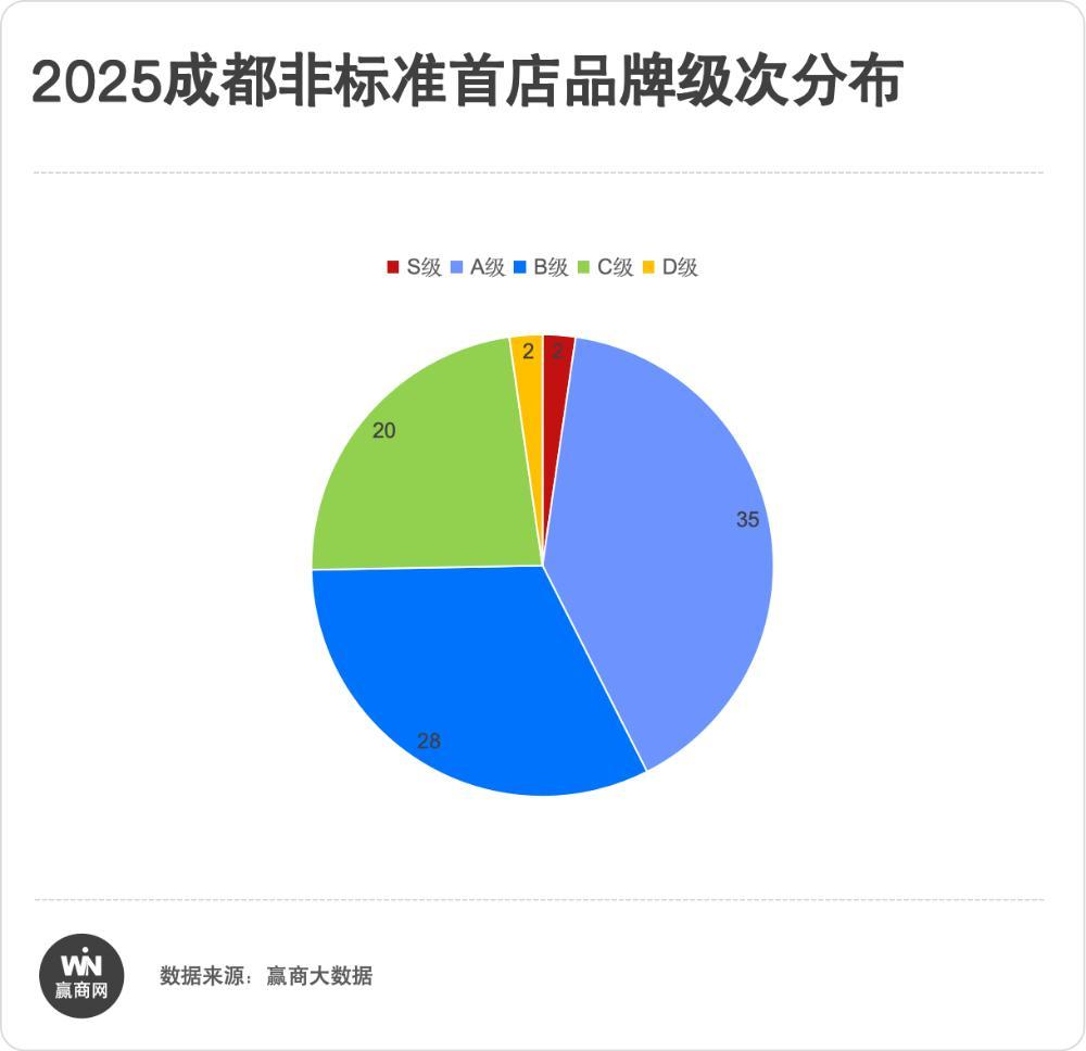 共计有87家非标准首店的集中涌现。其中S级2家,A级+B级合计63家,占比72.4%,折射出这些品牌方在成都布局非标准店型时,倾向于将最高规格、最新概念、最具创新性的门店赋予其头部品牌的成都首店。