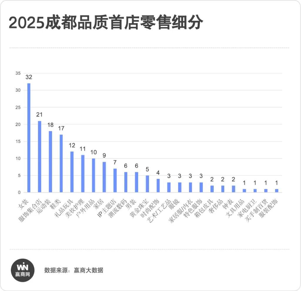 零售首店方面,服装业态以107家占据主导,成为成都首店经济的核心支撑。从细分格局来看,服饰赛道一家独大,其中女装以32家领跑全品类,是品牌首店布局的第一大赛道;服饰集合店达21家,场景化、多品牌集合模式备受市场追捧;运动装引进18家,折射出健康生活与户外潮流的崛起趋势;此外,鞋类 、礼品玩具 、美妆护理同样跻身核心主流品类,年内开出10家以上首店,仍是商场吸金标配。